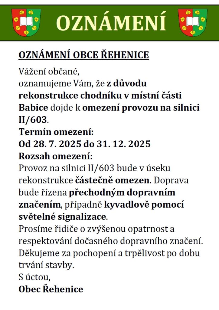Vážení občané, oznamujeme Vám, že z důvodu zahájení stavby REKONSTRUKCE CHODNÍKU A VO V OBCI BABICE dojde k omezení silničního provozu na komunikaci II/603 v místní části Babice.