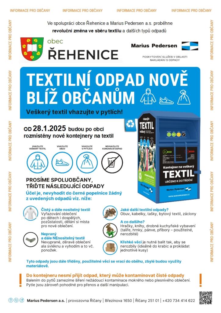 Oznamujeme občanům, že jsme zrušili smlouvu s firmou TextilEco, z důvodu vysokého nájmu za kontejnery. Od zítra 28. 1. 2025 budou nahrazeny novými kontejnery modré barvy od svozové firmy Marius Pedersen a.s. Svozová místa zůstávají stejná, a to v Křiváčku a Babicích.